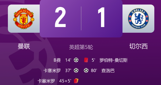 北京时间9月21日凌晨0时30分,2025-26赛季英超第5轮焦点战在老特拉福德球场展开角逐,曼联主场迎战切尔西。上半场蓝军门将桑切斯5分钟直红,B费破门+红魔生涯第100球,卡塞米罗扩大比分+染红,蓝军21分钟换3人,下半场查洛巴扳回一城,加纳乔未获得出场机会。最终十人曼联主场2-1战胜十人切尔西,红魔取得主场两连胜,蓝军各赛事两连败+3场不胜。积分榜方面,曼联积7分升至第9,切尔西积8分位居第6。